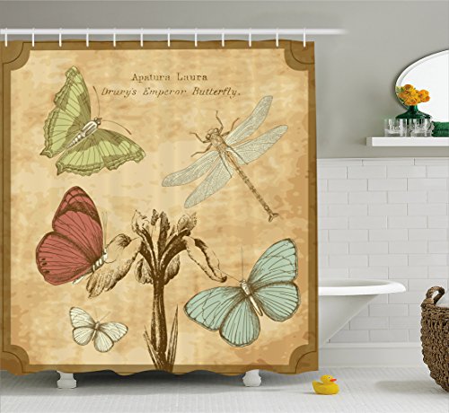 Dragonfly Shower Curtain by Ambesonne, Retro Style Butterflies with Flower Petals and Grunge Effects Artwork, Fabric Bathroom Decor Set with Hooks, 75 Inches Long, Sand Brown Caramel