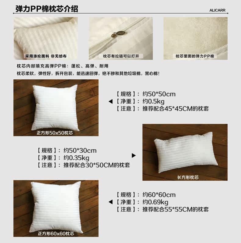PP cotton pillow: Down-proof pillowcases as containing high elastic three-dimensional hollow PP cotton, environmentally safe and fluffy. Pillow size is usually large than 5CM pillowcase to ensure guaranteed full fill effect!
