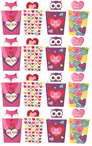 - Includes: (16) Treat Containers (6"x3.75) in 4 Cute designs (Cardboard). Fox "Hugs", Owl "Be Mine", Hearts, Candy Hearts "So Sweet"