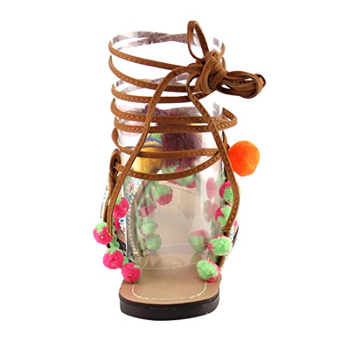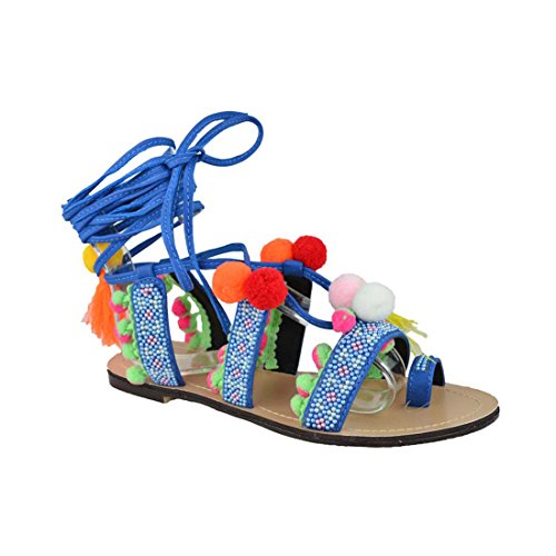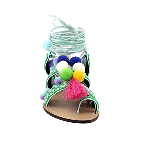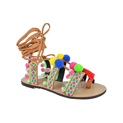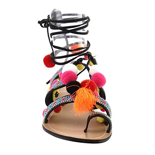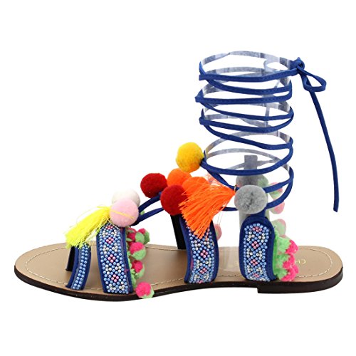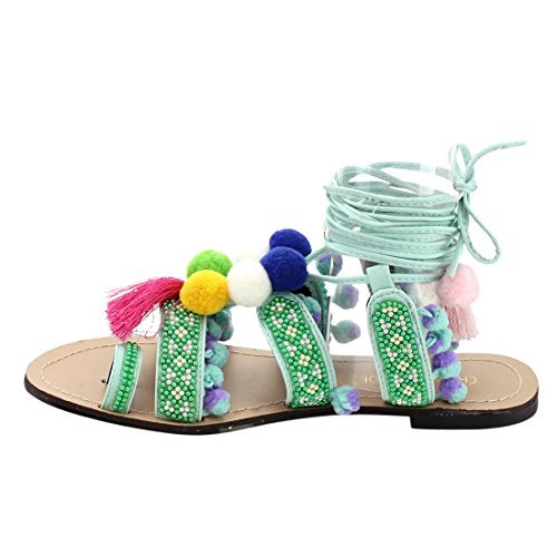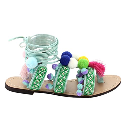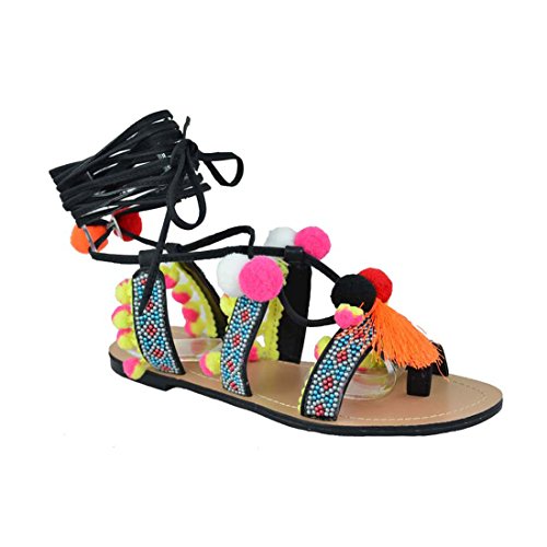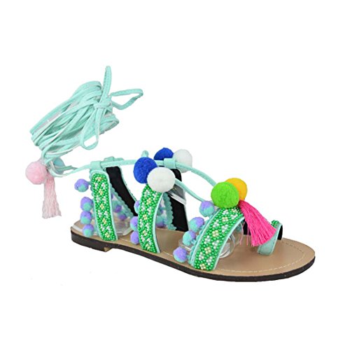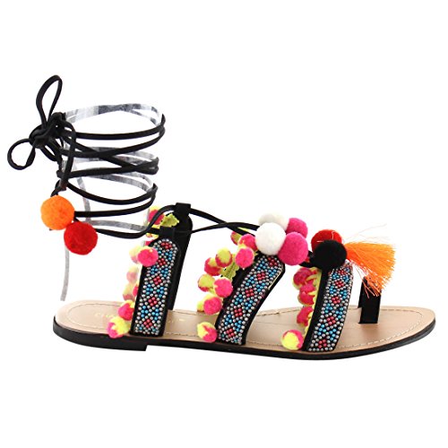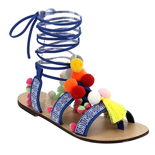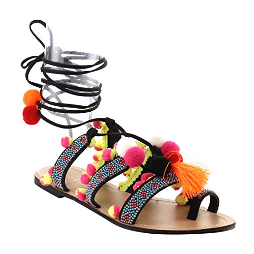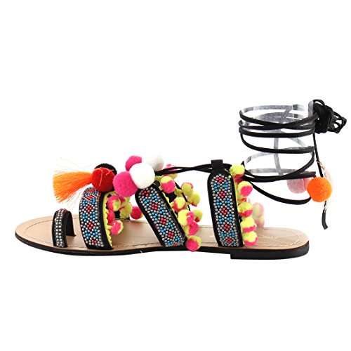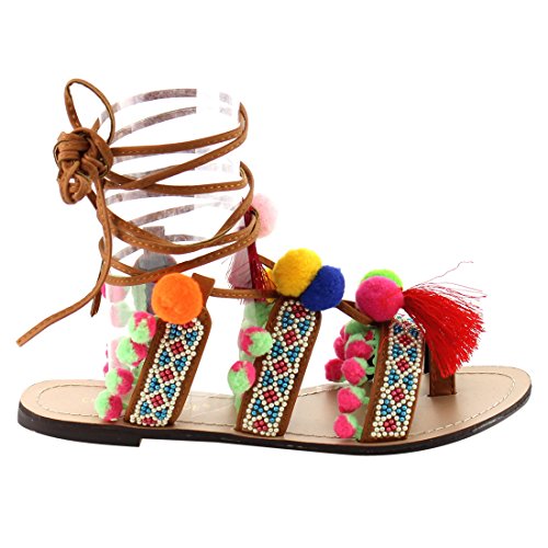 Product DescriptionWalk comfort and fashion with these flat sandals are featuring an open toe, contrast stitching, a leg wrap feature and pom poms, tassel, beads embellishments, and a flat heel.0
