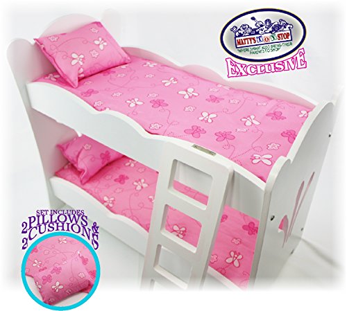 Studio : Homeware Publisher : Homeware Binding : Toy Product Description Matty's Toy Stop 18 Inch Doll Furniture White Wooden Bunk Beds with 2 Pink Pillows, 2 Pink Cushions Ladder - Fits American Girl Dolls, is AWESOME! Compatible with American Girl, Madame Alexander, Our Generation, so much more... Made of real, high quality wood! Features an awesome design that looks just like the real thing! Easy to assemble and the perfect addition to any playroom! Awesome for naptime with your dolls! Made of high quality composite wood products and features smart, sturdy construction! For Ages 3 and up - Bunk Bed measures 20.8" long x 11.8" wide x 17.7" tall - adult assembly required - phillips head screwdriver required (not included) 0