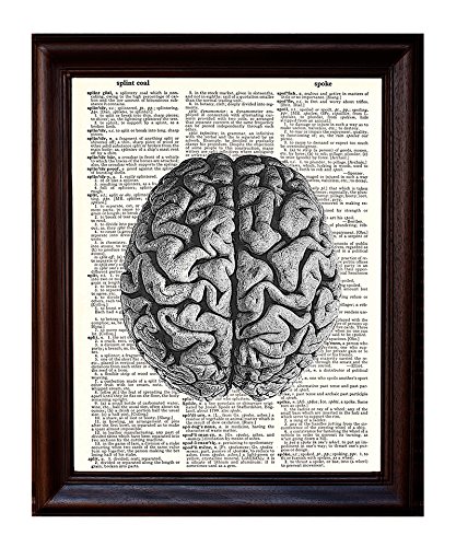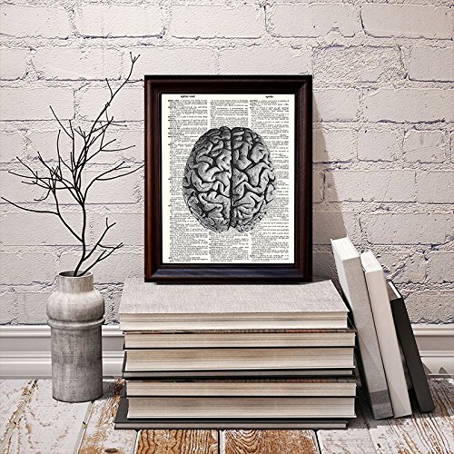 This human brain design is printed on beautiful vintage dictionary paper. These prints are definitely a conversation starter and look fabulous as a wall hanging. Each design is carefully selected and then printed on vintage dictionary paper giving it that beautiful golden color that only comes from age. Since we use real book pages some unevenness or spotting occurs, this only adds another layer to the print, making each one truly unique. Dimensions are approximately 8" W x 10.5" L. *** Frames are not included.***Feature