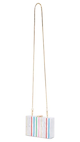 Rhinestone box clutch. Crafted in Acrylic with rhinestone and stripe detailing. Rectangular clutch with top buckle closure. Features interior pocket and drop-in shoulder chain. Fully lined.