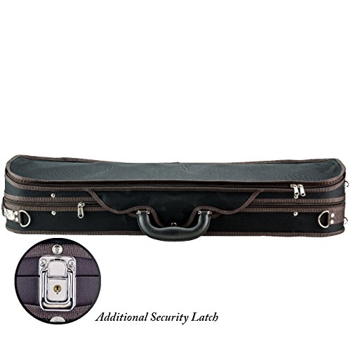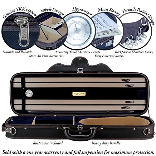 Strong, lightweight, wood-shell, full-suspension case with straps, storage for four bows and additional accessories, genuine YKK zippers, string tube, lined violin blanket, padded straps, hygrometer, and weatherproof woven-nylon exterior.