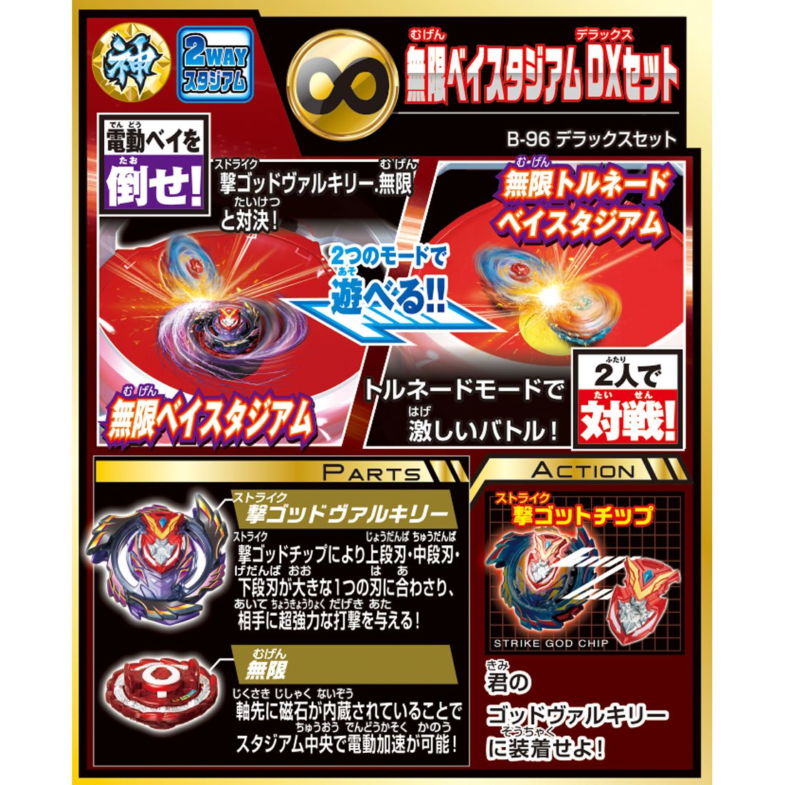 【セット内容】撃ゴッドヴァルキリー無限(撃ゴッドチップ、レイヤー、ドライバー)(1),無限ベイスウタジアム(ベース・透明カバー・固定パーツ)(1),電動ユニット(1),ブラックプレート(1),トルネードプレート(1),ツール(1),ベイコードカード(1),正しい遊び方説明書(1),ステッカー(1)