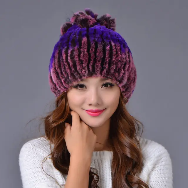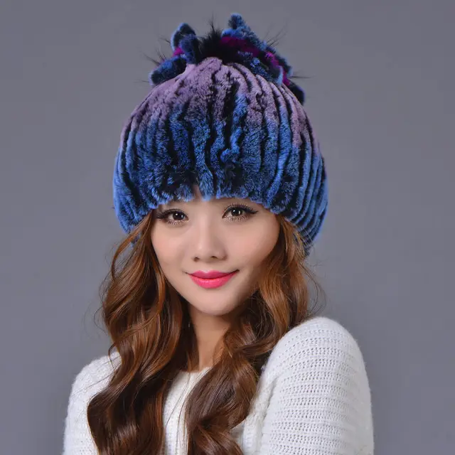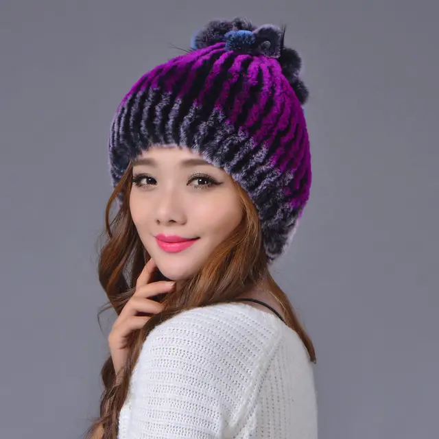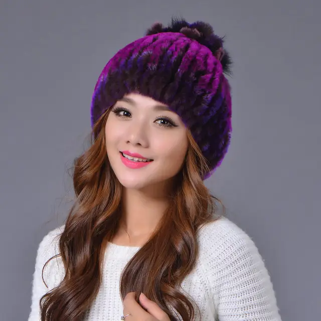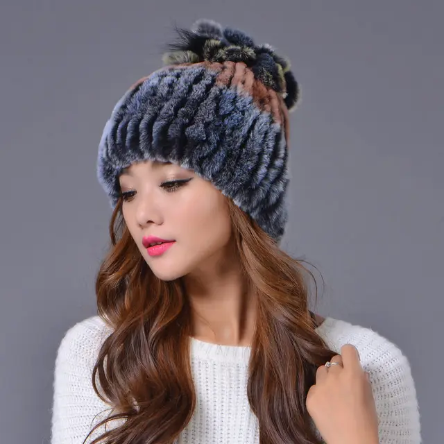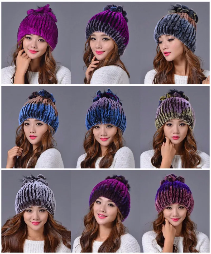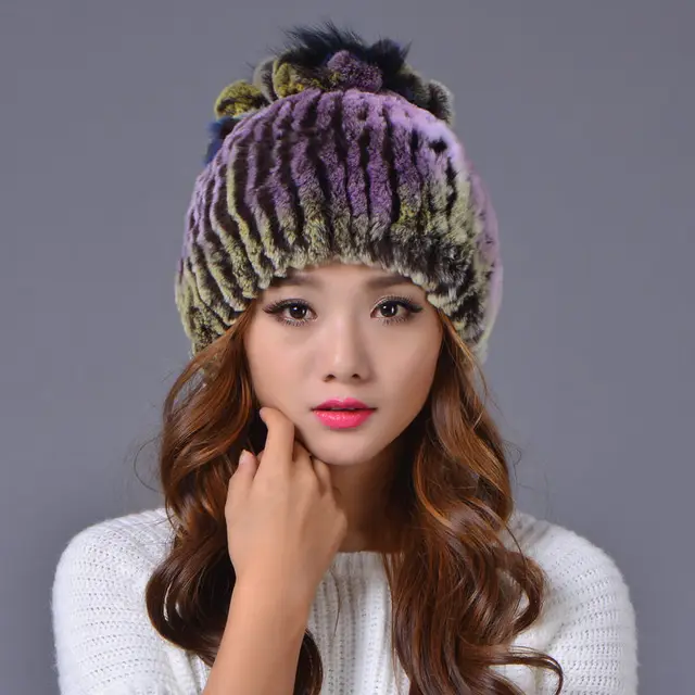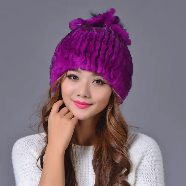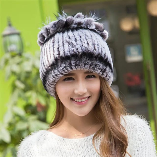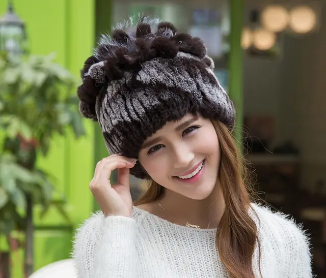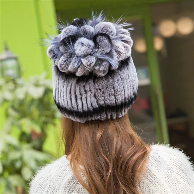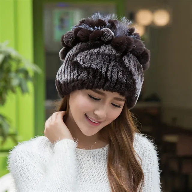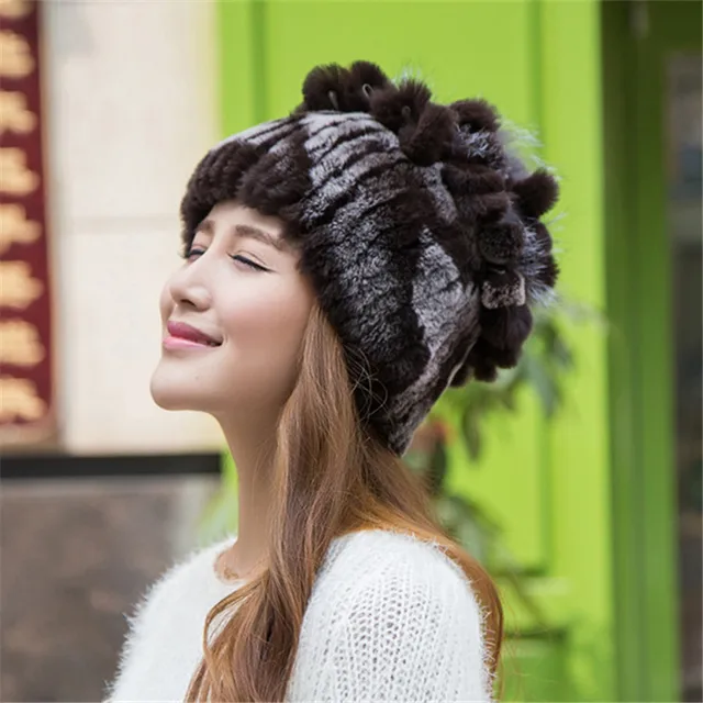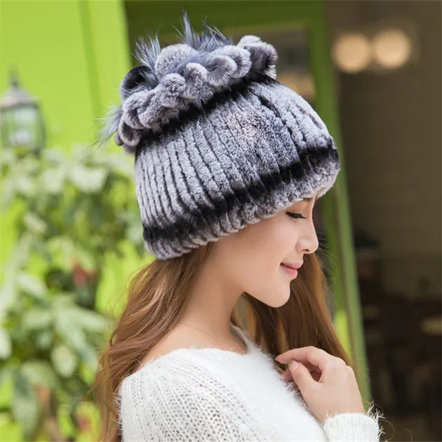 | [해외]겨울 비니 모피 모자 여성 니트 100% 렉스 토끼 모피 모자 꽃 최고 무료 크기 캐주얼 여성의 모자 |