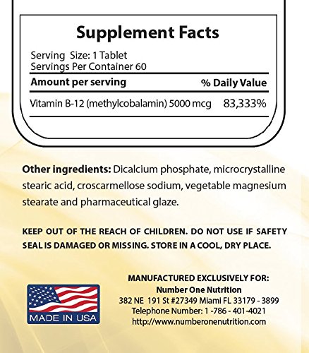 -. Binding : Health and Beauty -. Brand : Number One Nutrition -. EAN : 0600518981398 -. Feature : Vitamin b12 may help increases mental acuity and focus. / Each tablet have 5000mcg of Methylcobalamin. / Water-soluble vitamin may help stimulate your brain for daily productivity, mood enhancement and energy. / Vitamin b complex employs a time release element to make sure each tablet does what it is expected to do in your body. / Made in the USA in an FDA Approved Facility, our doctor-formulated bottle contains a 60-day supply for your daily needs. Order yours today! -. Label : Number One Nutrition -. Manufacturer : Number One Nutrition -. PackageQuantity : 1 -. ProductGroup : Health and Beauty -. ProductTypeName : HEALTH_PERSONAL_CARE -. Publisher : Number One Nutrition -. Studio : Number One Nutrition -. Title : Number One Nutrition Vitamin B12 5000 mcg, 60 count -. UPC : 600518981398