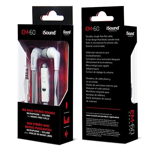 It's all about the bass - the EM60 offers incredible bass tones in a compact form. These earbuds seal your ears to create cavernous bass tones. Complemented with a tangle free smooth, flat cable, this headset rivals headphones of a much higher price! crystal clear stereo creates a concert like effect for music, or use the inline microphone to jump on a call. Lightweight, and comfortable, the EM 60 is a winner!Feature