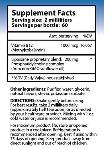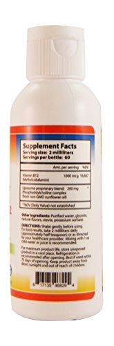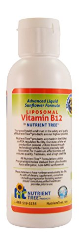 Nutrient Tree Liposomal B12 with 1000 mcg of Vitamin B12 (as methylcobalamin). Natural Phosphatidylcholine from non-GMO sunflower oil. 60 servings per Bottle! Benefits of Vitamin B12: Boosts Energy Levels* Supports Carbohydrate/Fat Utilization & Metabolism* Promotes Mental Clarity/Health, Memory & Brain Function* Supports Healthy Red Blood Cells* Supports Healthy Weight Management* Promotes Healthy Skin, Hair, and Nails* Liposomal Vitamin B12 Why Nutrient Tree Liposomal Supplements are Superior: Simply put, here is why Nutrient Tree's Advanced Liquid Sunflower formulations are the best high dose supplements on the market: • No stomach upset. No cramps. Nutrient Tree Liposomal encapsulation technology literally sneaks the supplement past the caustic acids in your stomach to deliver a health-enhancing, megadose straight to the thirsty cells of your body. • Made with REAL liposomes at less than 400 nanometers in size. Liposomes MUST be at least this small or smaller or they will not work. • Made with non-GMO sunflower oil. Nutrient Tree liposomes are made with healthy, pure, Non-GMO phosphatidylcholine (PC) uniquely derived from sunflower oil. • 100% alcohol free, non-soy and gluten-free. Perfect for those with nut allergies and special dietary needs. • Mixes easily and tastes great. - Simply pour it in, give it a stir and drink. It's that easy! The fruity flavor is a customer favorite. • Made in an FDA-certified facility. - Nutrient Tree Liposomal Vitamin B12 is made under the strictest oxygen-free conditions, utilizing state-of-the-art liposomal encapsulation technology and the highest quality ingredients. • Priced right. - At Nutrient Tree, we value your health above everything else. We strive to provide you with the best Liposomal Products on the market at the most affordable price possible. Notice: Please gently shake bottle before use.Feature
