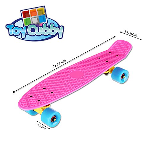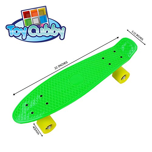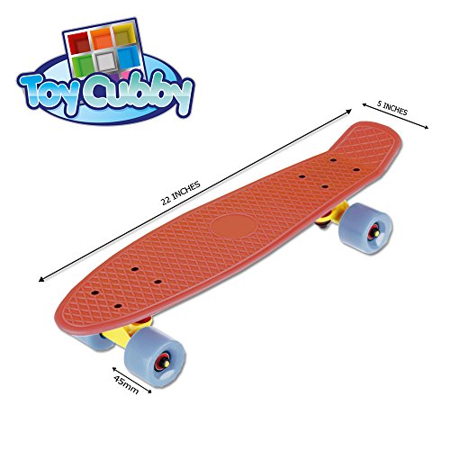 -. Brand : Toy Cubby -. Feature : A combination of smooth riding of a long board and the lightweight easy-to-carry aspect of a skateboard. / Made from Red polypropylene which has high resistant to many chemical solvents, bases and acids. / Deck size 22 x 3.125 inches equipped with ABEC-5 bearing and a wheel size of 45mm PU wheels. / Perfect collaboration of Durability and Smoothness, Can hold up to 100kg, rolls fast and turn easily. / Small, can fit inside Bag and School locker and also available in different colors. -. Label : Toy Cubby -. Manufacturer : Toy Cubby -. MPN : TC1-0030 -. PackageQuantity : 1 -. PartNumber : TC1-0030 -. ProductGroup : Sports -. ProductTypeName : OUTDOOR_RECREATION_PRODUCT -. Publisher : Toy Cubby -. Studio : Toy Cubby -. Title : Toy Cubby 22" Retro Style Cruiser Skateboard