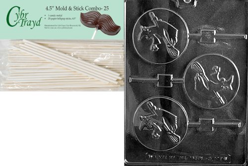 Cybrtrayd 45St25-H117 Witch Lolly Halloween Chocolate Candy Mold with 25 4.5-Inch Lollipop Sticks