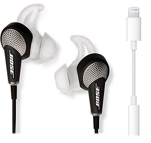 -. Feature : This Bundle Includes 2 Products: (1) Bose QuietComfort 20 Black In-ear Noise Cancelling Headphones with Remote and (1) Lightning to 3.5 mm Headphone Jack Adapter / Noise cancelling reduces surrounding distractions, letting music stand out. Stay Hear+ tips provide long-lasting comfort plus stability / Aware mode lets you hear what's around you when you need to, at the touch of a button / Exclusive TriPort technology and Active EQ help deliver lifelike, digital-quality audio / This adapter lets you connect devices that use a 3.5 mm audio plug to your Lightning devices