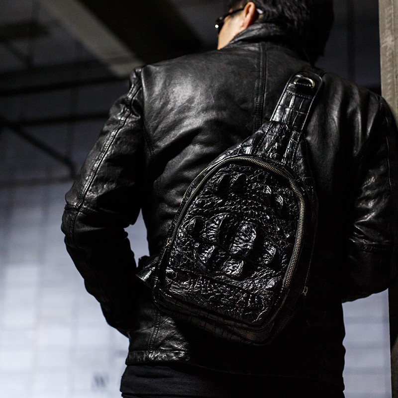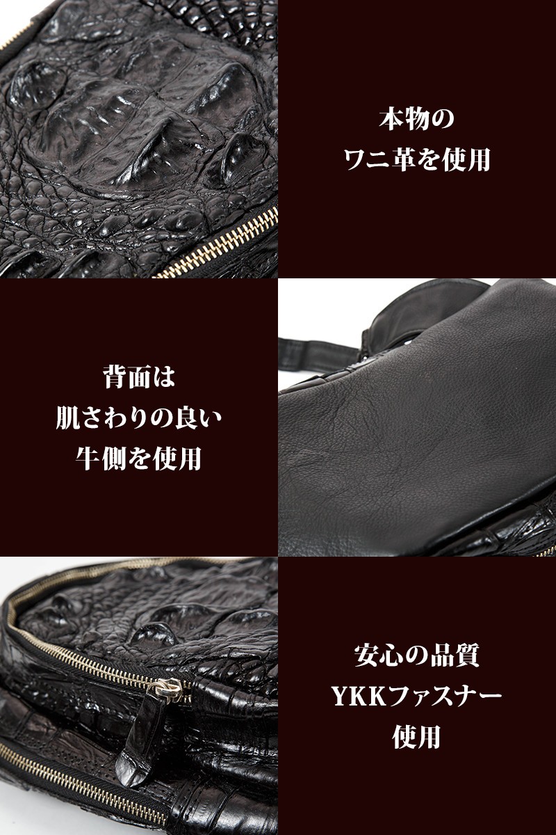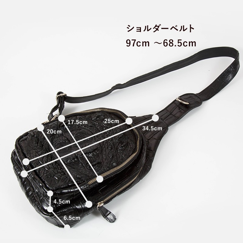 【素材】 牛革 内側:牛革/ナイロン(裏地) 【サイズ】本体外寸 高さ:約34.5cm 幅:約20cm マチ:約6.5cm、約4.5cmベルト長さ 97cm~68.5cm内ポケット 深さ:12.5cm 幅:15.5cm【カラー】ブラック【仕様】ポケット×2 (内部×1、フロント部分×1) 上質のワニ革を使用して革職人がハンドメイドで仕上げたレザーボディバッグ。財布等普段持ち歩く小物も 余裕をもって収納可能。使い込むほどに渋味が出て末長く愛用出来ます。Deep Zone ワイルドでセクシーを上品にまとめる男のレザーブランド。自分買いからプレゼントにも人気でオススメです。