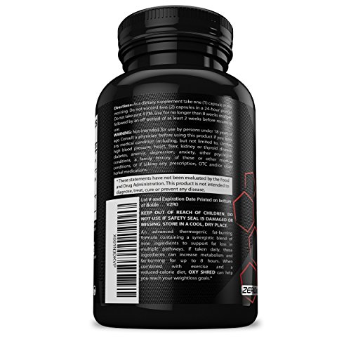 -. Feature : EXCEED ALL YOUR WEIGHT LOSS GOALS: Strling to lose excess fat and rid yourself of those few extra pounds? Now you are not alone in this! Order your Oxy Shred thermogenic fat burner capsules and find your peace of mind again. Lose weight, burn stubborn belly and stomach fat and get the beach body of your dreams. / MINIMIZE CRAVINGS & SUPPRESS YOUR APPETITE: This thermogenic fat burner dietary supplement works as an appetite suppressant as well. It can help you reduce cravings and free your mind of all kinds of comfort food. Maintain a healthy eating lifestyle with only 1 or maybe 2 Oxy Shred fat burning caps per day! Simple as that! / SCIENTIFICALLY FORMULATED FOR MAX RESULTS: All of our weight loss booster supplements are proudly made in the USA, in FDA and GMP registered facilities and are scientifically formulated for maximum results. Each weight loss pill is a powerhouse blend of 9 powerful ingredients. ZERO fillers, additives, preservatives and sugar! / INCREASE ENERGY & INGITE YOUR METABOLISM: Feeling weak and tired all the time? Is your metabolism really slow or slish? No more worries! Our Oxy Shred thermogenic fat burner can boost your energy levels, trigger your metabolic rate, improve your athletic performances and help you feel confident about yourself! / SHRED FAT OR GET YOUR MONEY BACK: Your 100% satisfaction is our top P.R.Iority. That is why our weight and fat loss supplement is backed by our unconditional 365 day money back guarantee policy! Sculpt your body, burn fat and lose weight or get your money back! Suitable for women, men, fitness enthusiasts and athletes.