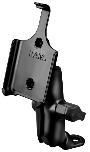 The RAM-B-180-AP9U consists of a double socket arm, 45 degree angled base with 9mm hole and custom high strength composite cradle for the Apple iphone. The offset base is often used on motorcycles, attaching to the mirror frame of most BMW motorcycles. The mount contains adjustment points at both ends of the double socket arm; this allowing for almost infinite adjustment and perfect viewing angles. RAM’s patented design also dampens shock and vibration helping to extend the life of your mobile device. With a turn of a single comfortable to grasp knob, adjustments can be made and the sleek hourglass shape of the arm assembly compliments the lines of any motorcycle