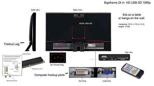 -. Binding : Electronics -. Brand : Bigeframe -. EAN : 0648499871574 -. Feature : Load your photo content onto a USB drive. / Play HD 1080p video or images Play in a continuous loop. / Internal speakers / wall bracket / 1 year warranty / Now includes VGA and DVI ports for other devices / hangs flat on the wall or sits on a table -. Label : Bigeframe -. Manufacturer : Bigeframe -. ManufacturerPartsWarrantyDescription : 1 year warranty -. Model : BIG24USB16KA -. MPN : BIG24USB16KA -. PackageQuantity : 1 -. PartNumber : BIG24USB16KA -. ProductGroup : Photography -. ProductTypeName : CAMERA_OTHER_ACCESSORIES -. Publisher : Bigeframe -. Studio : Bigeframe -. Title : Big Digital Picture Signage Frame 24 Inch USB SD LED 1080p Media Box Plus DVI and VGA Ports great for Home or Business -. UPC : 648499871574