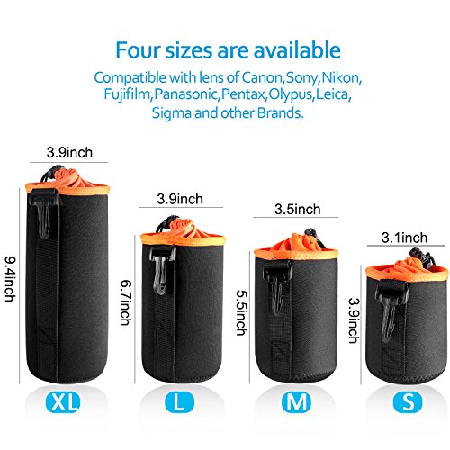 Package: Includes Small(3.1" x 3.9"), Medium(3.5" x 5.5"), Large(3.9" x 6.7") and Extra Large(3.9" x 9.4") Neoprene lens Pouch bags for DSLR Camera Lens. Lens not included in package
