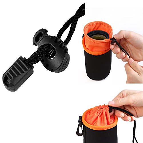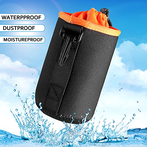 Functions&Portability: Waterproof DSLR Camera Lens bag made of Durable Neoprene can Protects against Moisture, Sand, Dust, and Accidental Bumps or Scratches, well suited to shutterbugs who love traveling. Hook allows you to attach the lens pouch anywhere with a ring (such as camera bags and backpacks)
