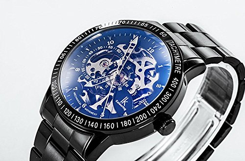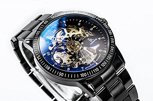 -. Feature : IK colouring Black Steel Mechanical Watch for Men / Black Watch Dial with Coated Glass. Luminous Hands / ALL Black Steel Watch Case and Watchband, Fold-over-clasp with IK Colouring Brand Logo / Skeleton Hollow-out Watch Dial. See-through. The tachymeter bezel only for decoration / Water Resistance 1 ATM (splash proof). Come with GuTe minimalist Watchbox ECO-friendly with Simple Instruction