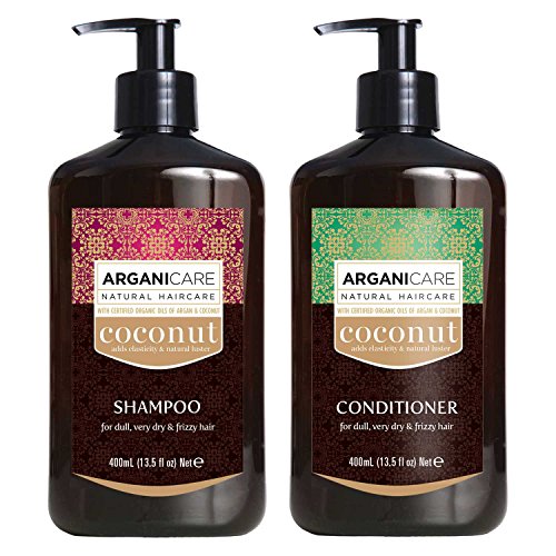 An extraordinary Arganicare hair care set combining a Shampoo and Conditioner, both rich with Argan and Coconut oil to nourish and hydrate hair. Designed to maintain the moisture balance of the hair cuticle, and to improve manageability and elasticity of your hair, they will moisturize, strengthen and promote growth leaving your hair shiny and full of volume. This set of ever popular Arganicare Coconut hair care products includes a 400ml (13.5oz) bottle of Shampoo and matching Conditioner. This winning combination of shampoo and conditioner will hydrate, cleanse and revitalize dull, very dry and frizzy hair, nourishing it with easily absorbed and deeply penetrating essential elements and vitamins. With Organic oils of Coconut and Argan.Feature