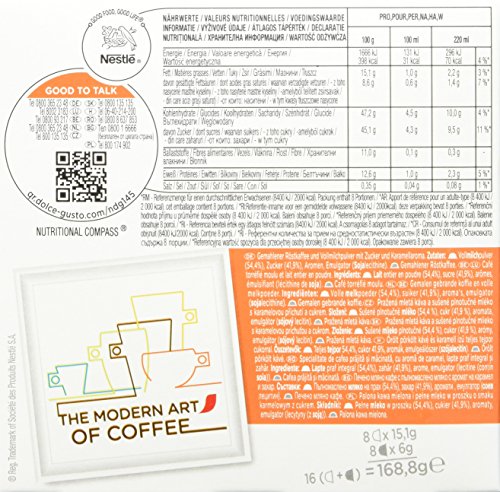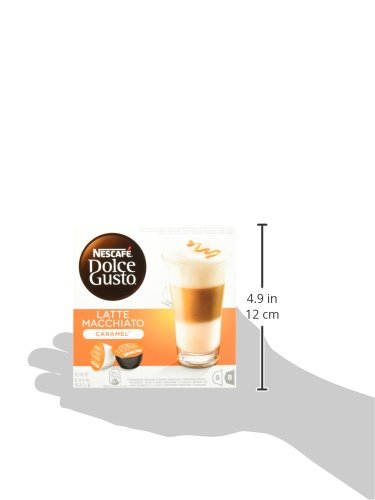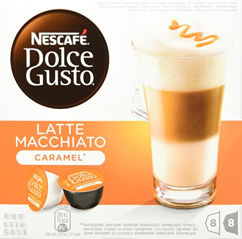 Nescafé Dolce Gusto Caramel Latte Macchiato, Karamell, Kaffee, Kaffeekapsel, 16 Kapseln (8 Portionen):Latte Macchiato ist der Star unter den Kaffeespezialitäten und Dank Dolce Gusto ein Hochgenuss mit Gelinggarantie! Aufgeschäumte Milch und aromatischer Espresso zaubern die typischen drei Schichten mit köstlichem Karamellgeschmack ins Glas. Latte Macchiato Caramel ist eine Spezialität aus Milch, Espresso, Karamell und Milchschaum. Inklusive 10 Original Dolce Gusto Genusspunkten. , Zutaten:DG0258: Kaffee-Kapsel: Gemahlener Röstkaffee (Arabica) Milch-Kapsel: Milchpulver, Zucker, natürliche und künstliche Aromen, Sojalecithine Närhwerte pro 100 g: Brennwert (kJ): 1666 (kcal): 398 Fett (g): 15.1 - davon gesättigte Fettsäuren (g): 8.6 Kohlenhydrate (g): 47.2 - davon Zucker (g): 45.1 Ballaststoffe (g): 11 Eiweiß (g): 8.1 Salz (g): 0.35 , Lieferumfang:3 x 1 Packung Dolce Gusto Caramel Latte Macchiato mit 16 Kapseln für 8 Portionen Packungsinhalt: 8 Kapseln mit 6g Espresso + 8 Kapseln mit 15g Milch Nettogewicht: 168g / PackungFeature