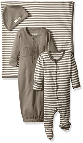 This organic cotton, 4-piece set is the perfect take-me-home and keep-me-cozy ensemble. A gown, footed overall with fold-over cuffs, hat, and generously-sized swaddling blanket includes all the essentials any new baby needs