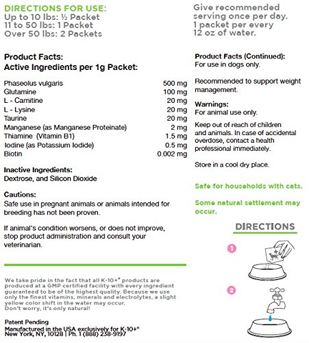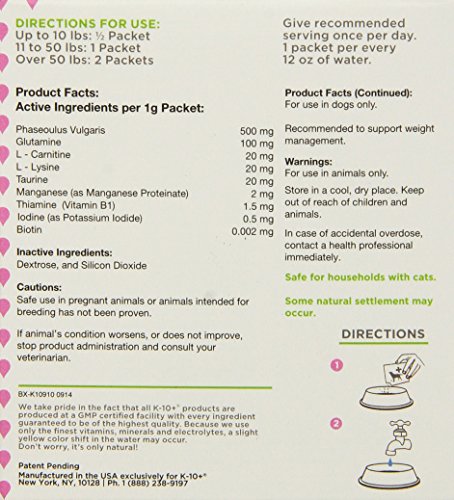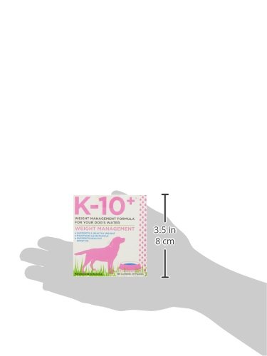 K-10+ Weight Management Formula For Your Dog's Water eliminates the need for hard to swallow pills and messy gels. Tear open a packet of K-10+, pour the contents into your dogs water bowl and simply add water. K-10+ Weight Management for dogs is formulated to support a healthy appetite and weight in dogs. Each packet of K-10+ Weight Management provides dog with the optimal combination of ingredients to help them achieve and maintain a healthy weight. One box of K-10+ contains 28 individual packets and will last approximately one month depending on the size of the dog. Scientifically formulated to: -Maintain fat Utilization -Maintain Carbohydrate Absorption -Maintain Lean Muscles.Feature