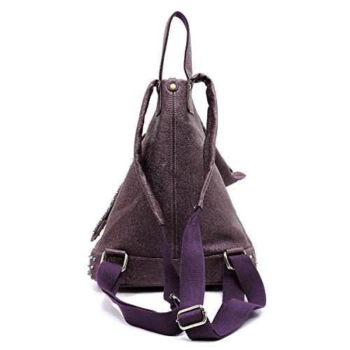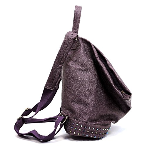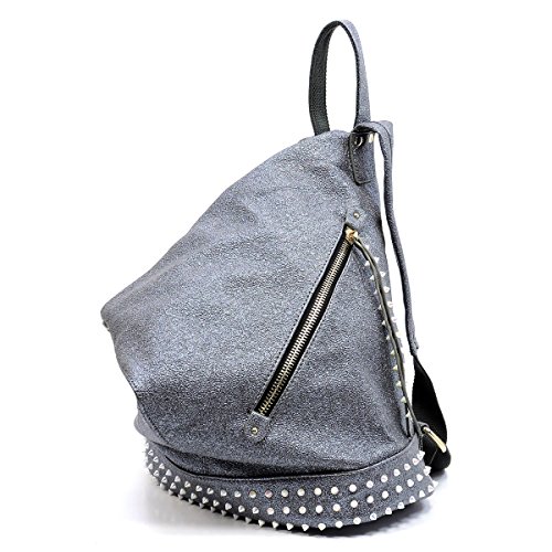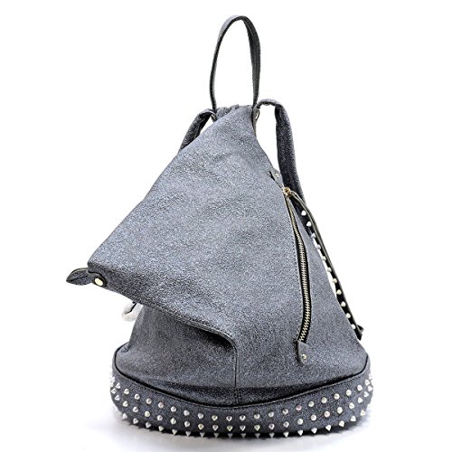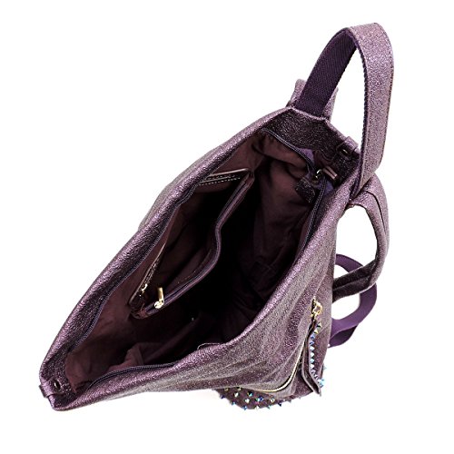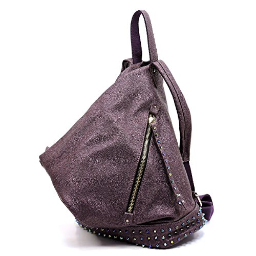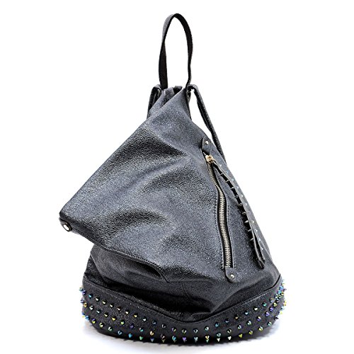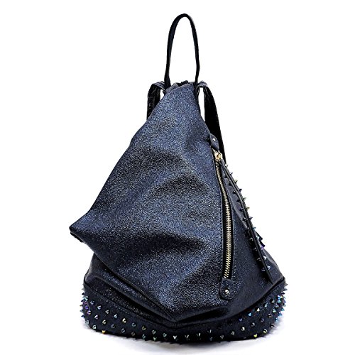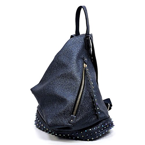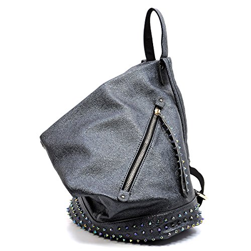 -. Feature : Soft Distressed Metallic Faux Leather Exterior w/ Holographic Cone Studded Accents / Zipper closure / Large Deep Compartment / L 12 * H 15 * W 5.5 - Adjustable Straps