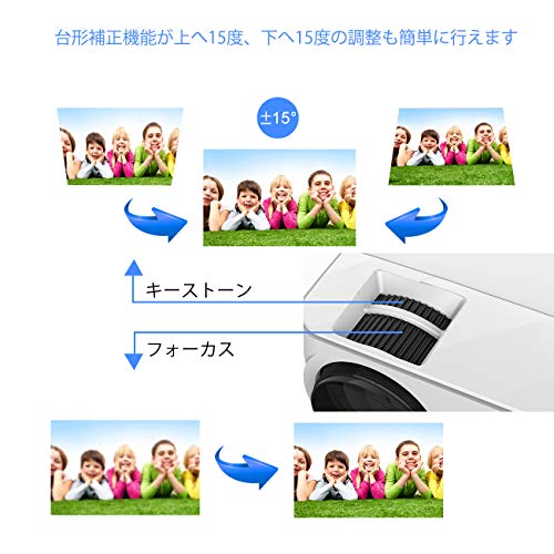 このモバイルプロジェクターは台形補正機能が付いて、上へ15度、下へ15度の調整も簡単に行えます。投写距離によってマニュアルフォーカスすると、はっきり投写できます。