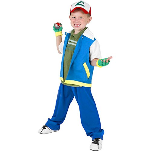 -. Binding : Apparel -. Brand : Wilton -. Color : Blue -. Department : boys -. Feature : Blue pants with elastic waist / Aqua blue short sleeve jacket / Red and white hat / Green fingerless gloves / Green polo shirt and shoes not included -. ProductGroup : Toy -. ProductTypeName : ACCESSORY -. Size : Medium 8-10 -. Title : Wilton Boys Child's Classic Pokemon Ash Costume