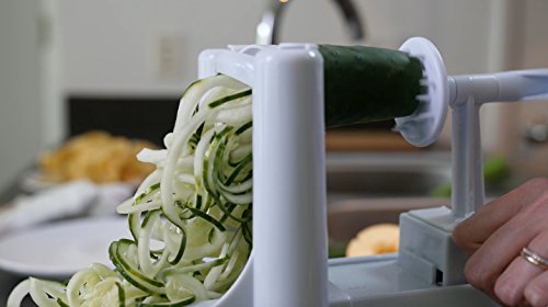 SAVES YOU TIME- Never slave over a knife again. Now comes with 2 additional blades (ultra thin 2mm angel-hair blade and curly-fry blade) for a total of 5 blades for all of your Spiralizing! It is the only tool you need to prepare vegetable noodles, ribbons and even slices. Stainless Steel blades and BPA Free.