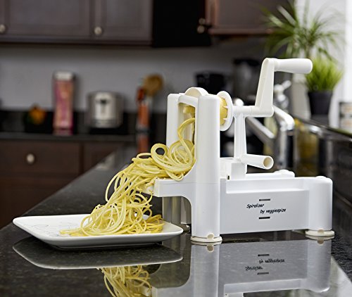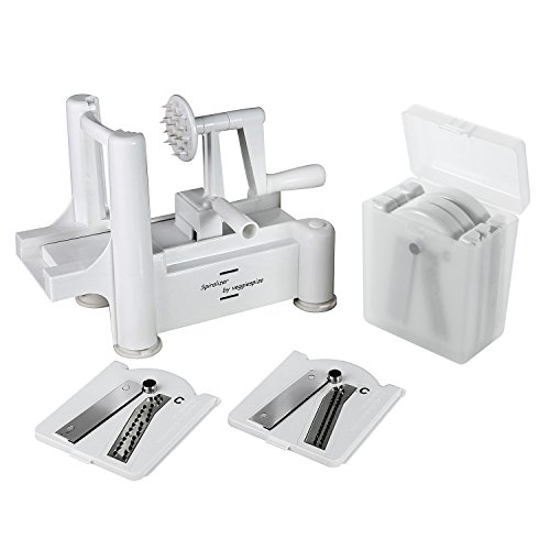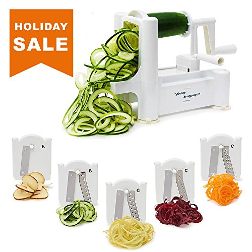 NEW MOLD 30% THICKER PARTS THAN BEFORE! - 2017 5 BLADE SPIRALIZER - AS SEEN ON THE FOOD NETWORK! Now comes with 2 additional blades (ultra thin 2mm angel-hair blade and curly-fry blade) for a total of 5 blades for all of your Spiralizing!
