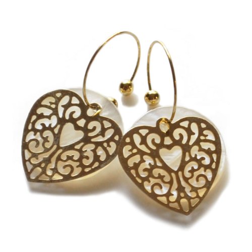 -. Feature : 【ハート透かしモチーフ】素材:真鍮+Kメッキ サイズ:約19mm x 17mm / 【白蝶貝】直径:約17mm / 【フープイヤリング】直径:約15mm 素材:鉄+メッキ / アクセサリーSaltオリジナルポーチ付