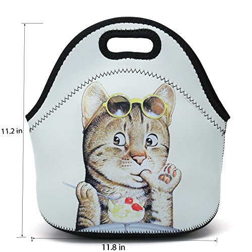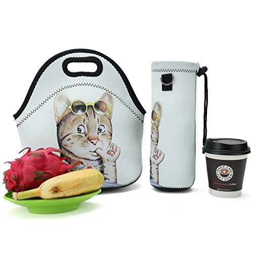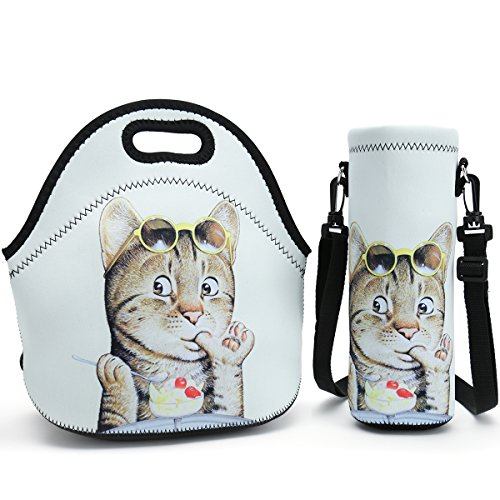 Neoprene Lunch Bag, Thick insulated Lunch Box Bag For Women,Men & Kids+Water Bottle Carrier Adjustable Shoulder Strap For Snacks & Lunch- Suitable For Travel,Picnic,School,Office (Cat Eat Desserts)