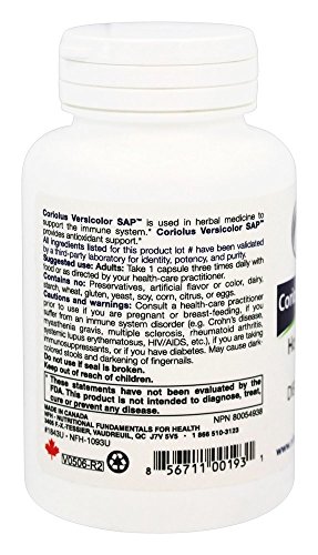 Studio : NFH-Nutritional Fundamentals for Health Publisher : NFH-Nutritional Fundamentals for Health Binding : Health and Beauty Product Description Coriolus Versicolor Sap 60 Capsules Dietary Supplement Hot-Water Extract Coriolus Versicolor Sap is used in herbal medicine to support the immune system.* Coriolus Versicolor Sap provides antioxidant support.* Suggested use: Adults: Take 1 capsule three times daily with food or as directed by your health-care practitioner. Supplement Facts Serving Size: 1 Capsule Servings per Container: 60 Amount per serving: Coriolus versicolor (Trametes versicolor) extract 40% polysaccharides 40% beta-glucans 500 mg Other ingredients: Vegetable magnesium stearate and a non-GMO vegetable capsule composed of vegetable hypromellose and purified water. Contains no: Preservatives artificial flavor or color dairy starch wheat gluten yeast soy corn citrus or eggs. Cautions and warnings: Consult a health-care practitioner prior to use if you are pregnant or breast-feeding if you suffer from an immune system disorder (e.g. Crohn s disease myasthenia gravis multiple sclerosis rheumatoid arthritis systemic lupus erythematosus HIV/AIDS etc.) if you are taking immunosuppressants or if you have diabetes. May cause dark colored stools and darkening of fingernails. Do not use if seal is broken. Keep out of reach of children. 0