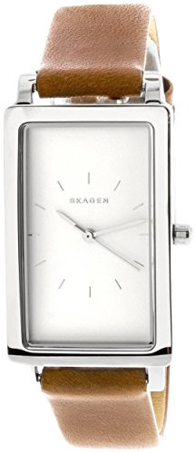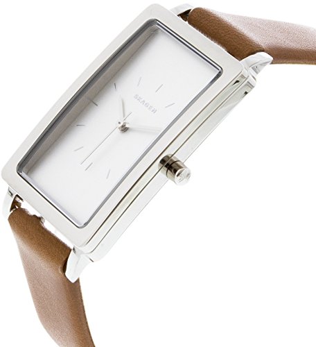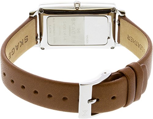 This sleek brown and silvertone watch from Skagen features a polished and eye-catching rectangle case.