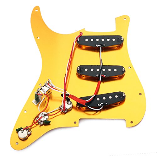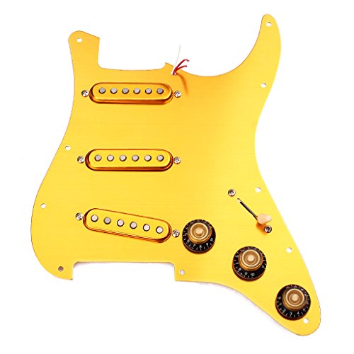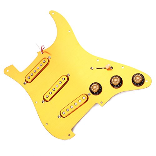 Description: 100% brand new and high quality 3-single coil pickups with magnets, 1-ply 11 screw holes in the side 1 volume and 2 tone control knobs Fit for Fender Stratocaster electric guitar Color: Gold Material: Aluminium alloy, copper, alnico