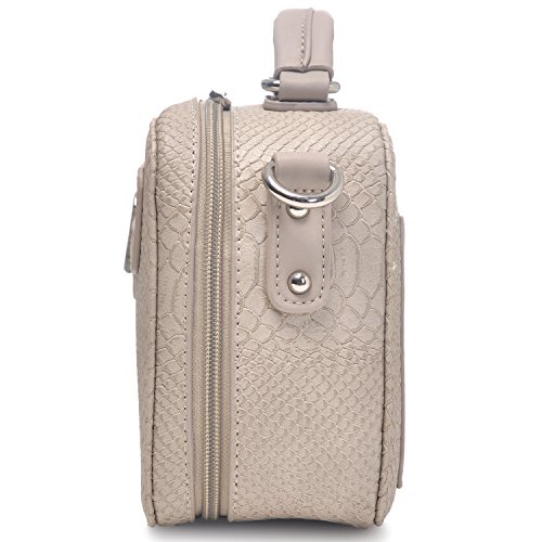 TONS OF STORAGE COMPARTEMENTS in a compact size:1 top zippered main pocket and 1 zip in front which decent this box bag;1 slip on back for easy access;1 ID window slip and 1 zippered slip inside for security essentials;enough room for your cell phone, wallet, makeup,tablets and toiletries;