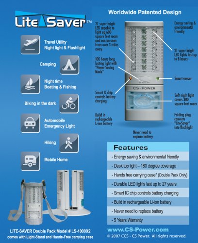 -. Binding : Tools & Home Improvement -. Brand : Lite Saver -. EAN : 0890751002992 -. Feature : Energy Saving & Environmentally Friendly / Desk Top Light - 180 Degree Coverage / Durable LED Lights Last up to 27 Years, Hands Free Carrying Case (Double Pack Only) / Smart IC Chip Controls Battery Charging, Built In Rechargeable Li-ion Battery / Never Need to Replace Battery, 3 Years Warranty -. Label : CS Power -. Manufacturer : CS Power -. Model : LS-1000 -. MPN : LS-1000 -. PackageQuantity : 1 -. PartNumber : LS-1000 -. ProductGroup : Lighting -. ProductTypeName : HOME_LIGHTING_AND_LAMPS -. Publisher : CS Power -. Studio : CS Power -. Title : (Single Pack) Emergency Power Outage LED Light for Home - Rechargeable Flashlight - Night Light -. UPC : 890751002992 -. Warranty : 3 Years.