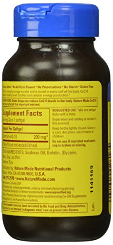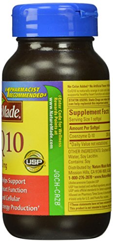 Studio : Nature Made Publisher : Nature Made Binding : Health and Beauty Product Description Dietary Supplement, Coenzyme Q-10. Recommended by pharmacists. Antioxidant - help maintains heart health (These statements have not been evaluated by the Foof and Drug Administration). No Artificial flavors. No Chemical solvents, yeasts, starch or gluten. USP has tested and verified ingredients, potency and manufacturing process. USP sets official standards for dietary supplements. 0