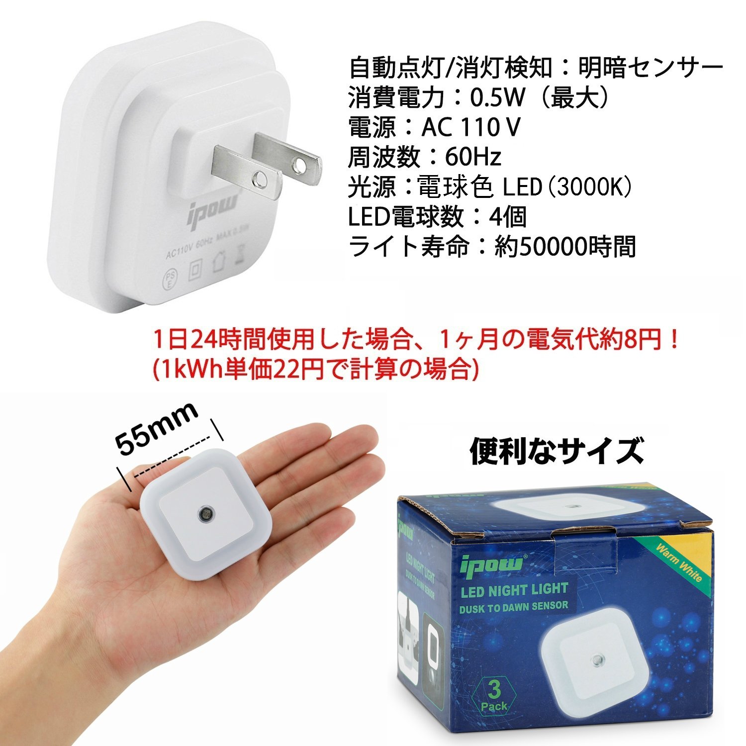 Electricity output 0.5W, lighting 12 hours every day, using just about 2.2 kWh electricity every year, only one month electricity charge is about 4 yen (calculated as 1 kWh unit price 22 yen).
