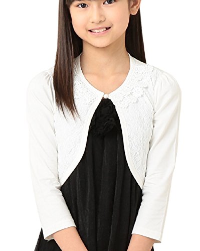 -. Feature : 結婚式や発表会などの出席にはオフホワイトのお子様用のボレロが大活躍、ちょっと羽織ってカーディガンのようにもお使い頂けます。花柄レースで特に大き目の襟はレトロな印象が可愛く清楚なイメージで目を引きことでしょう。 / ネックラインはクルーネックで留めボタンがフェイクパール、上一箇所を留めて軽く羽をれば直にフォーマルスタイルに変身、直ぐのお出かけにも便利です。 / 薄手の生地で軽い透け感がありますのでワンピース、ドレス等に合わせてコーデを楽しんで下さい。結婚式や2次会、パーティーのお供やお誕生会、ピアノの発表会等にも喜ばれますよ。 / 【サイズ】110、120、130、140cm 丈は比較的短めです 【生地】花柄レース  【留め具】ボタンがネック部分に一つ / ■110cm:丈 30cm / 肩幅 27cm / 袖丈 37cm ■120cm:丈 31cm / 肩幅 28cm / 袖丈 38cm ■130cm:丈 32cm / 肩幅 29cm / 袖丈 39cm ■140cm:丈 33cm / 肩幅 30cm / 袖丈 40cm