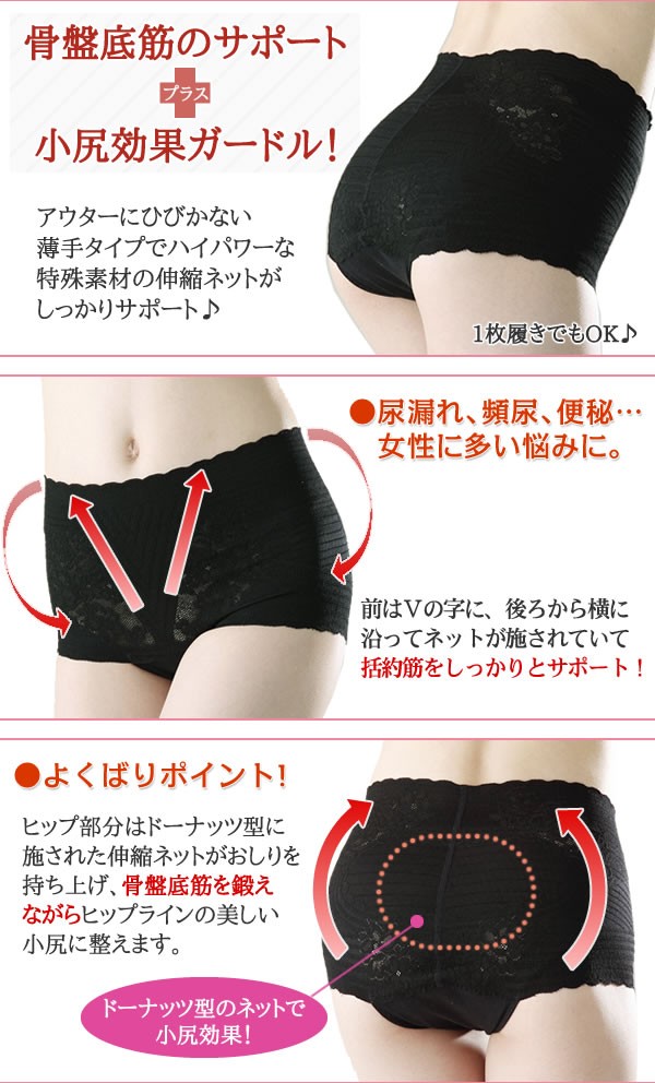 | 骨盤周りの筋肉低下による骨盤の緩みが女性特有の悩みにつながります。特殊素材によるハイパワーなネットでしっかりとサポートし、おしりも小さく見せられるお洒落な骨盤サポートガードル♪ |