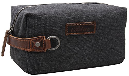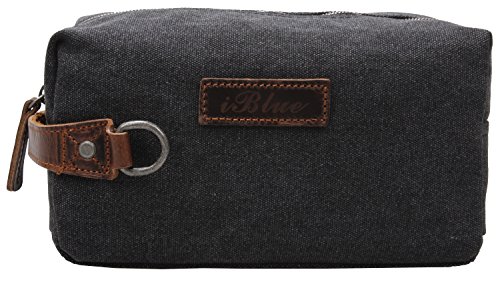 BASIC INFORMATION - Brand: Iblue - Material: Strong Canvas With Real Leather Accents -Zipper: Heavy Duty Metal Zipper With Leather Pull - Lining: Cotton - Color: Grey - Style: Toiletry bag - Weight: 0.25 KG - Size: 10.4 Inch L x 4.1 Inch W x 5.1 Inch H inches