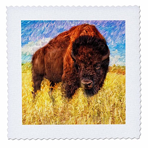 3dRose Buffalo Painting in Rich Browns, Blue Sky and Golden Grasses Quilt Square, 10 x 10"