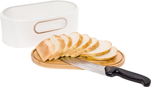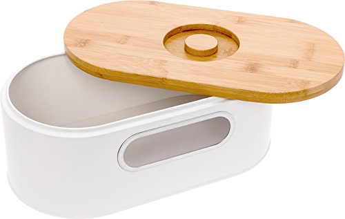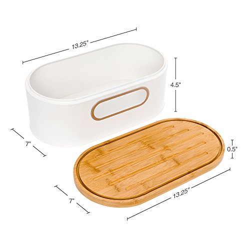 Studio : Mindful Design Publisher : Mindful Design Product Description Spruce up your countertop storage with this 2-in-1 Metal Bread Box with Wood Cutting Board Lid by Mindful Design! This space saving bread bin keeps your bread and pastries fresh and your kitchen looking sharp. A non-airtight seal allows for optimum airflow, preventing moisture and mold from growing, for longer lasting bread. The bamboo lid can be flipped over and used as a convenient cutting board, with crumb catching grooves on the cutting side to ward off messes. A clear side window lets you see what snacks lay inside, and the interior is large enough to a full loaf of bread or plenty of pastries of your choice! With a sleek, modern style that matches all styles of kitchen decor, the Mindful Design Bread Box will be your new favorite kitchen accessory. Measures 13.25" x 7" x 5". 0