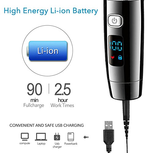 LED display & USB charge: Large LED display shows the batter life;1200mAh Lithium Battery, up to 2.5hrs consistent hair cutting after 1.5 hrs full charge time.
