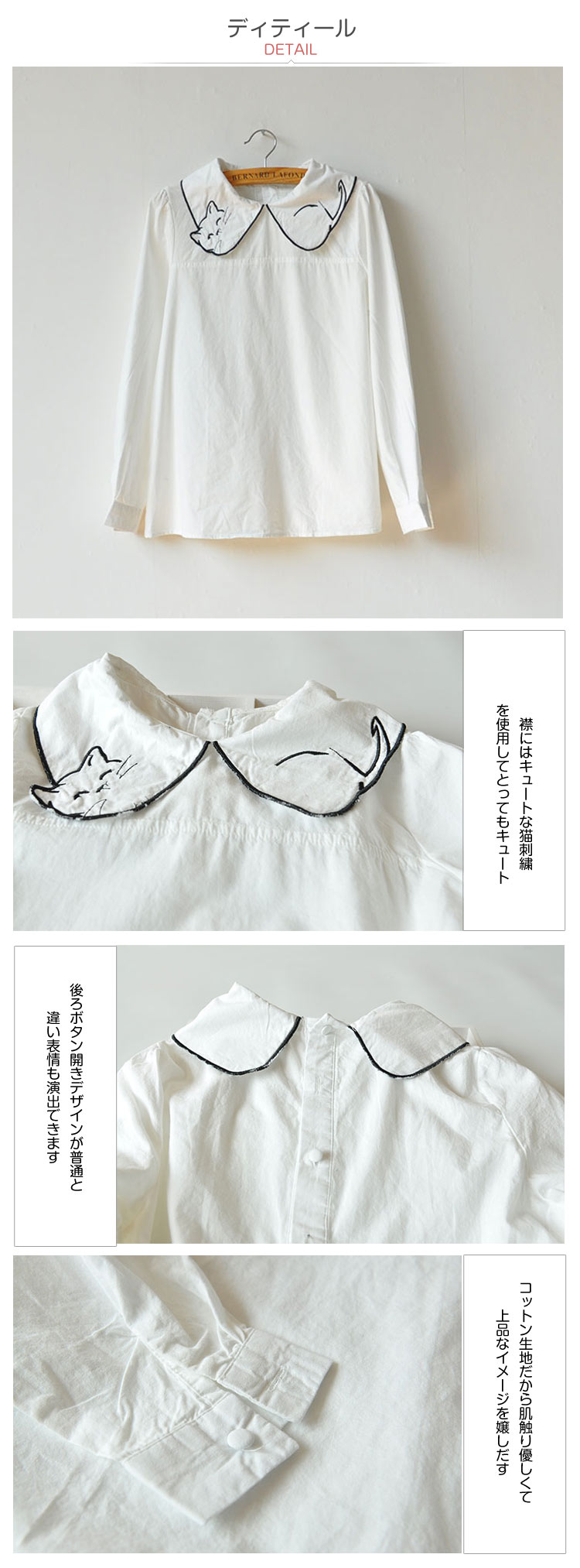 | ナチュラルな雰囲気の森ガールっぽいブラウス、ガーリーなデザインが大人気?一枚ではもちろん、インナーとしてアクセントになってくれるブラウス!優しいシルエットが女の子らしい一枚?襟にはキュートな猫刺繍を使用した、とってもCUTEで女の子らしさ満載アクセントにも?まるみのボタンを後ろ開きに施した、ディテールにもこだわりました☆コットン生地だから肌触り優しくて上品なイメージになり、デイリーに活躍する1枚です!? 清楚で上品なデザインなのでそのまま着るのはもちろん、寒い時ジャケットやカーディガンとあわせるのも◎女子力がウンとアップするオシャレアイテムをぜひお見逃しなく! ? | |