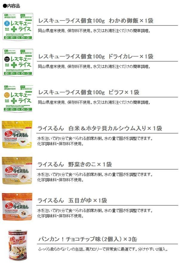 ■レスキューライス:ドライカレー 【内容量】100g 【原材料】うるち米・具(鶏肉・鶏卵・コーン・人参)・食塩・チキンエキスパウダー・野菜エキスパウダー・バター風味パウダー・酵母エキスパウダー・パセリ・香味油・粉末醤油・魚介エキスパウダー・ローレル・植物性油脂・調味料(アミノ酸等)・香料・酸化防止剤(ビタンミンE)・酸味料他 【製造者】株式会社山貴屋/岡山県岡山市北区吉備津1945-5