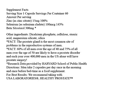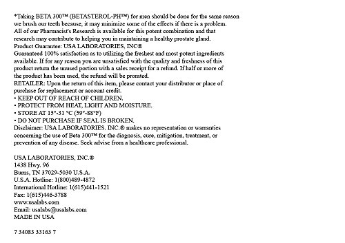-. Binding : Health and Beauty -. Brand : Beta 300 -. EAN : 0734083331637 -. Feature : The prostate gland is the most common site of problems in men of a certain age, and inflammation can occur in men of any age. / Benign hypertrophy of the prostate occurs in 33% of all men over 50.Taking BETA 300 (BETASTEROL-PWM) for men should be done daily for good health maintenance. / All of our pharmacists' research is available in this potent combination that may contribute to maintaining a healthy prostate gland. / Pure Beta Prostate 300 feeds the prostate nutrients that supports normal functioning. This pharmacist formulated blend that is an all-natural prostate supplement loaded with over three-hundred milligrams of beta-sitosterol per daily serving. / (BETA PROSTUROLTM) Pharmacist formulated Beta Sitosterol, Zinc & Selenium -. IsAdultProduct : 0 -. Label : USA Sports Labs -. Manufacturer : USA Sports Labs -. MPN : USALB360C - 3# -. PackageQuantity : 1 -. PartNumber : USALB360C - 3# -. ProductGroup : Health and Beauty -. ProductTypeName : HEALTH_PERSONAL_CARE -. Publisher : USA Sports Labs -. Studio : USA Sports Labs -. Title : Beta 300 for Prostate Health and Prostate Support - Combine with Saw Palmetto - Triple the power 300 milligrams Beta Sitosterol, Selenium, Zinc 60 Caps - 100% Natural Prostate Support Beta Prosturol -. UPC : 734083331637
